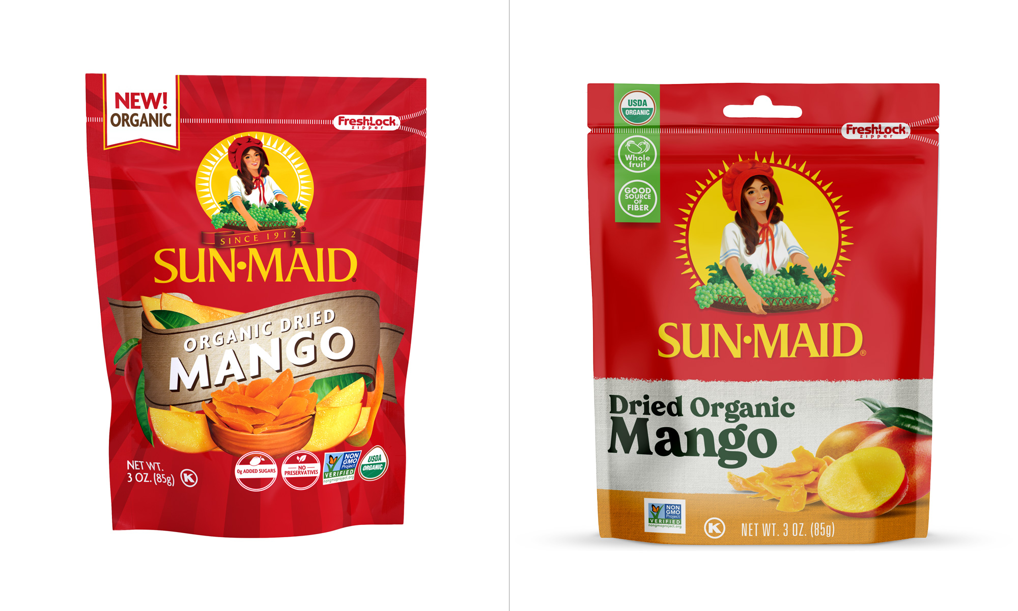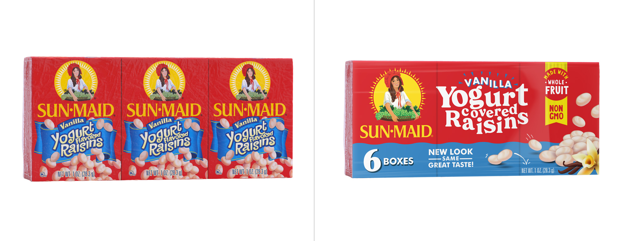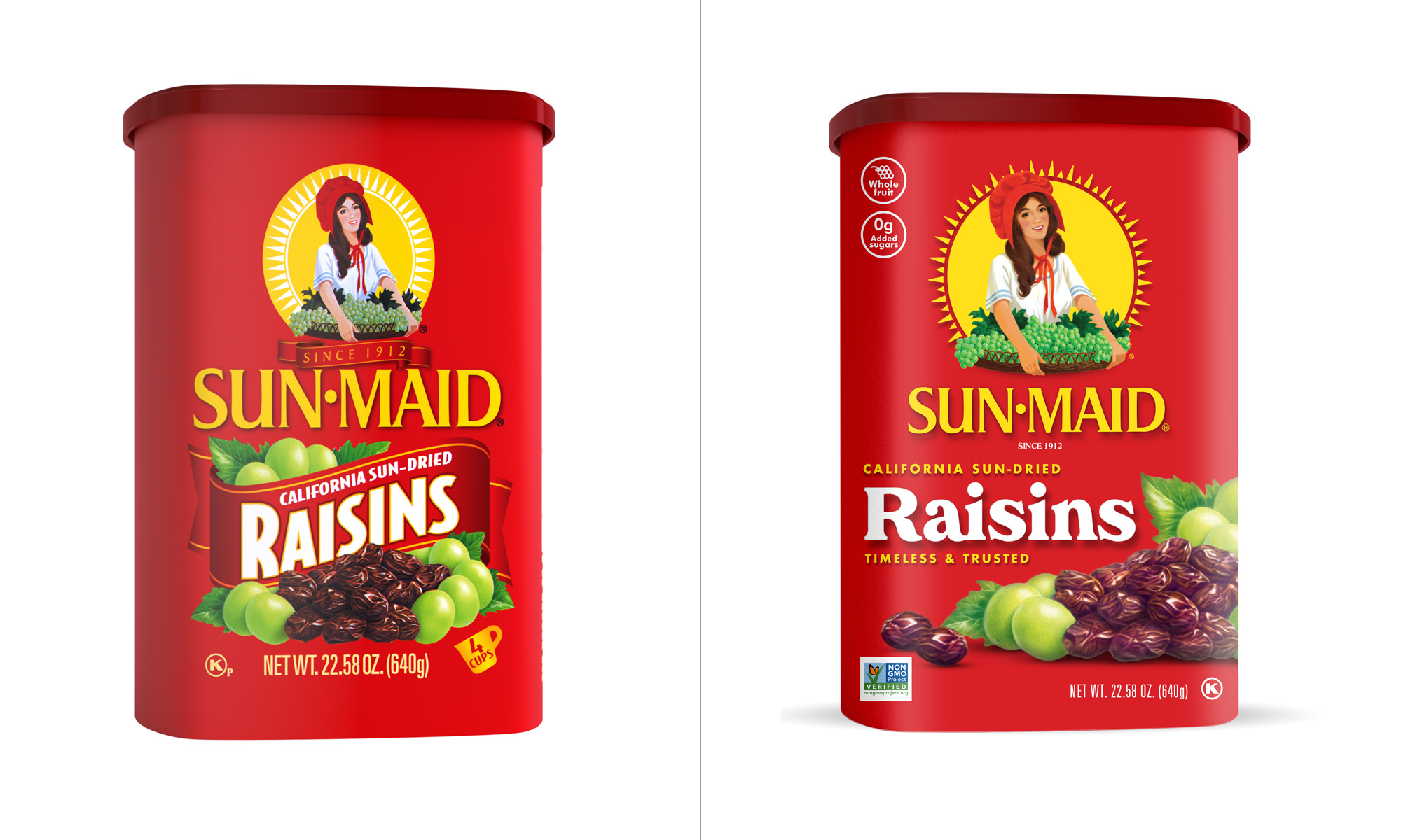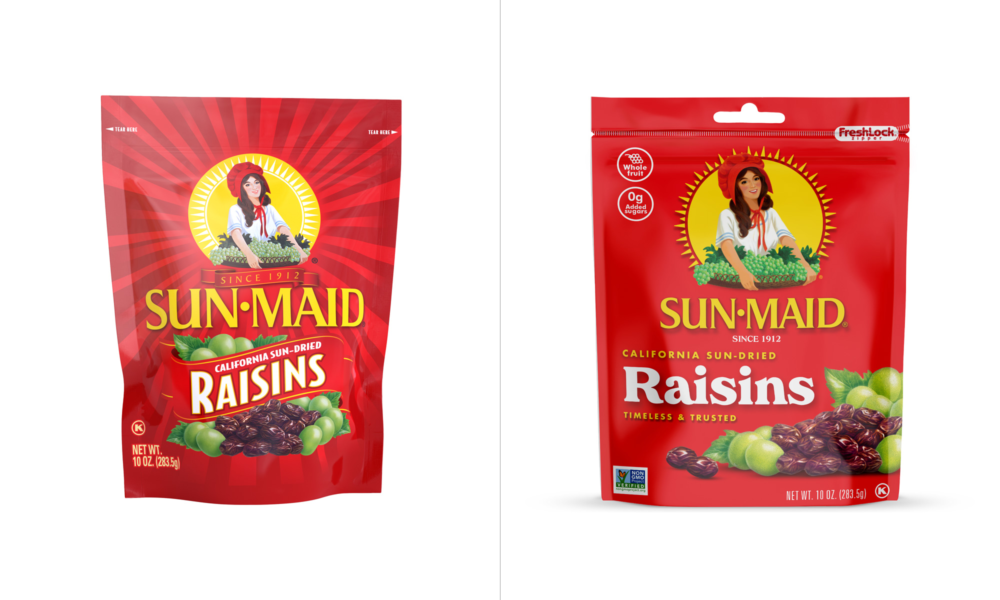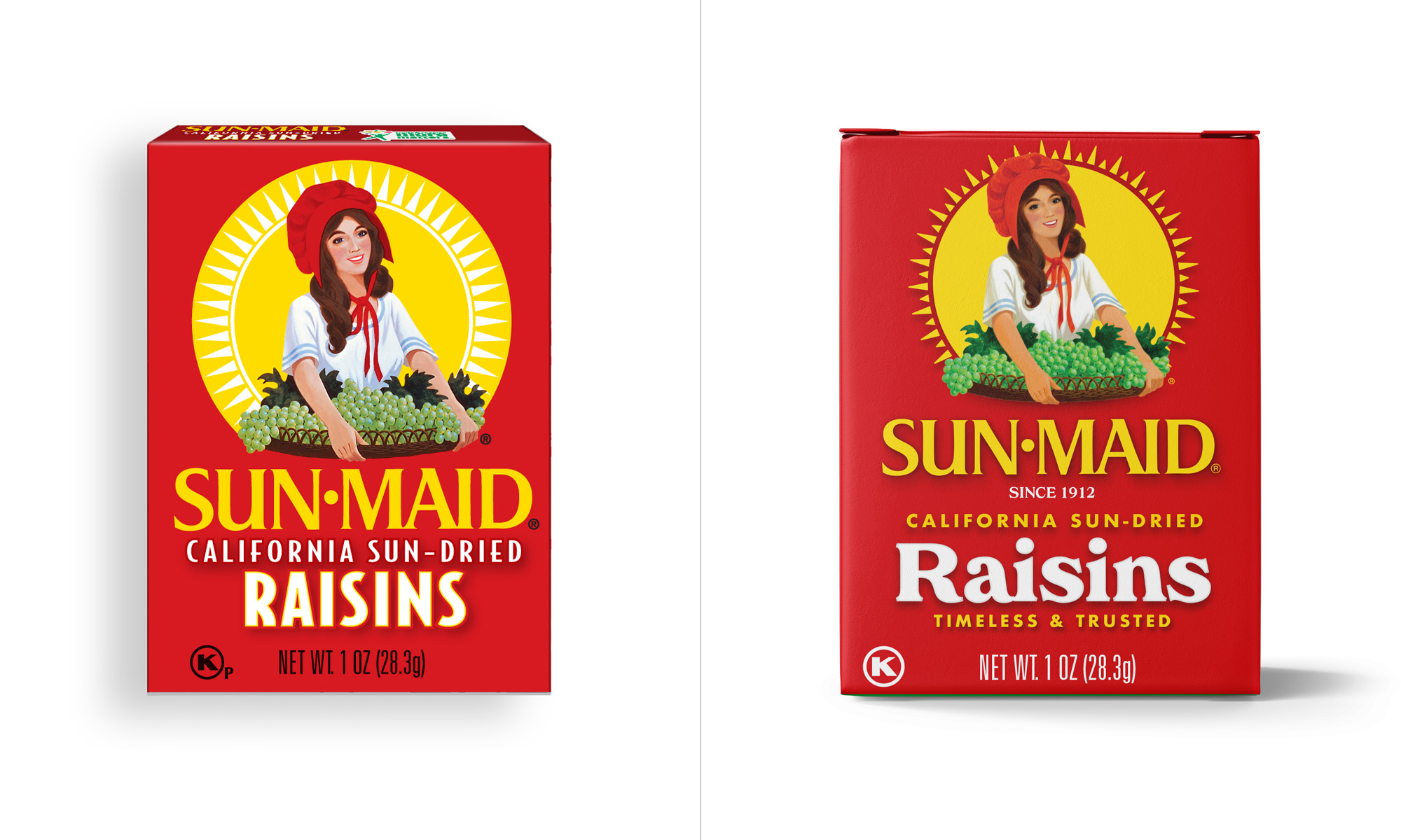 Sun-Maid食品品牌形象设计升级包括两部分,一个是食品品牌LOGO设计升级,还有一个是食品品牌包装设计升级。新设计升级的包装从本月开始上架,展示了一些变化,此次升级的定位主要是吸引千禧代的购物者为他们的家人寻找健康的零食。