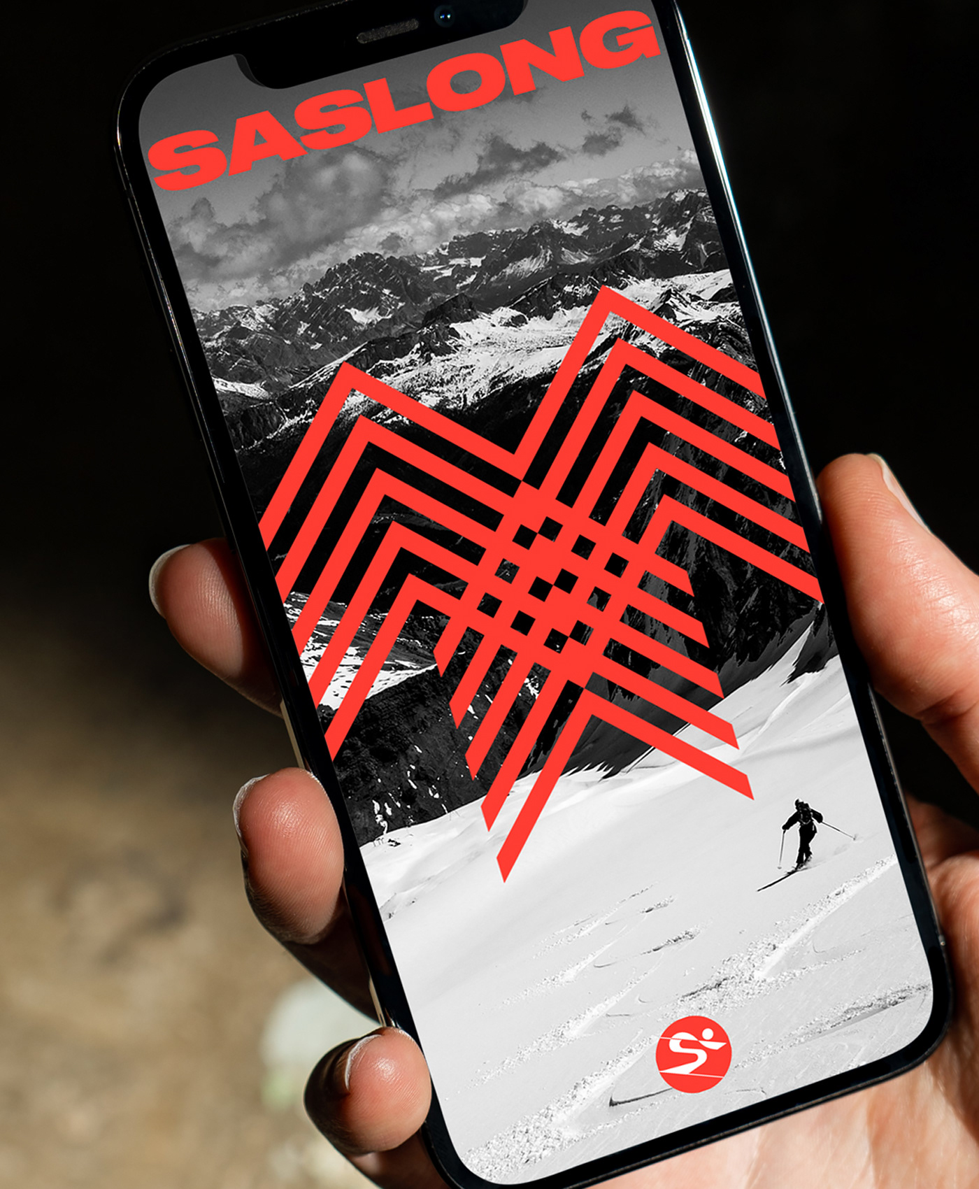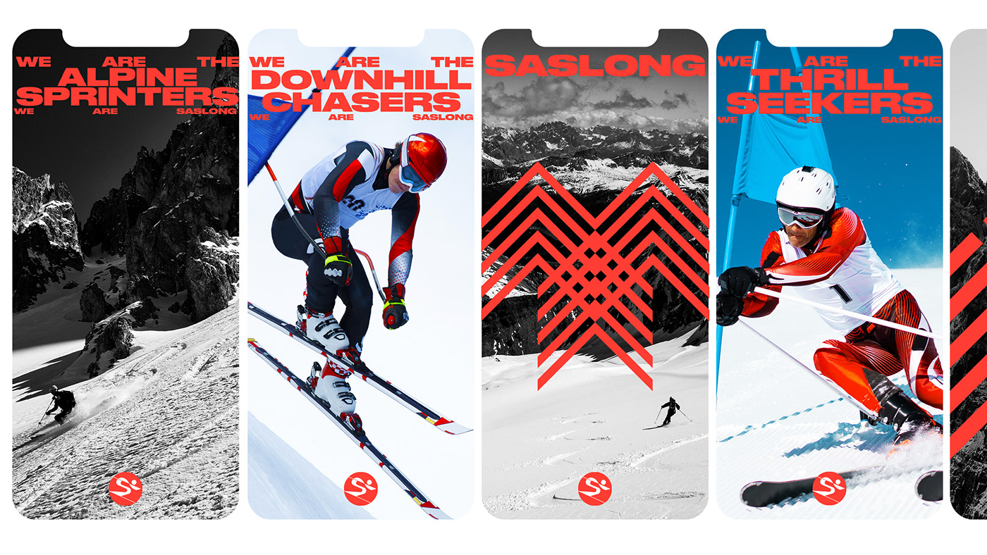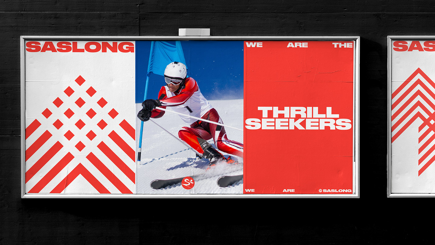 原始标志的传统在新的重新设计的标志中得以保留,设计不仅存在于物理媒体上,也存在于数字屏幕上。品牌语言的灵感来自滑雪者的动作和雪道,以鲜艳的橙色为特色,在明亮的雪地上突显出来。Saslong design system捕捉了滑雪运动中最具标志性的运动之一——障碍滑雪,其特点是滑雪杆之间呈之字形或波浪形,滑雪者在雪地上留下的轨迹产生了动态形状,这些动态形状被完全采纳为品牌形象设计中,用于静态和动态应用中。