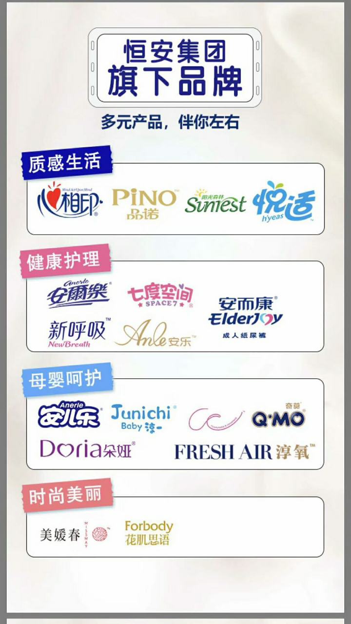 品牌介绍:恒安集团创立于1985年,经营领域涉及妇幼卫生用品、纸类产品、化妆及护肤类产品等,是国内最大的妇女卫生巾和婴儿纸尿裤专业生产企业,拥有固定资产二十多亿元,员工一万余人,在全国17个省、市、自治区,投资设立40多家生产公司,在全国设立40余家分公司以及200多个销售团队、上万人业务人员遍布全国城市、乡村,提供优质服务,保证公司产品对市场需求做出快速反应。 恒安国际集团有限公司于1998年在香港成功上市。