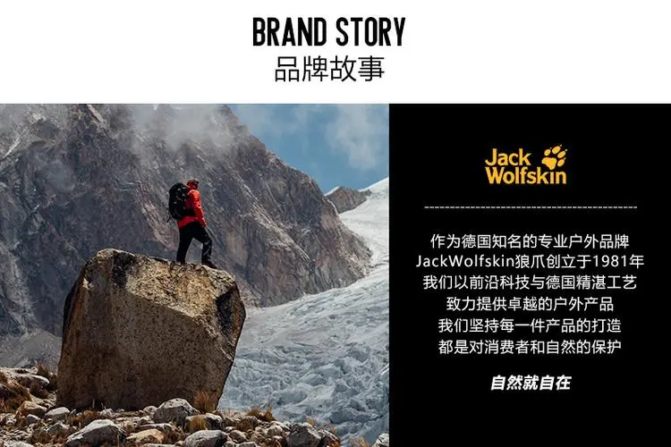 品牌介绍:JACK WOLFSKIN创立于1981年,总部位于德国的伊德斯坦因,是德国第一大户外运动品牌,也是欧洲户外市场上最重要的品牌之一。作为德国户外第一品牌,JACK WOLFSKIN自1981年以来,以独特的设计、上乘的品质,享誉欧洲。JACK WOLFSKIN相信户外运动应该是一种乐趣,户外爱好者使用装备时能时刻感到“At Home Outdoors”。2007年,JACK WOLFSKIN计划在10月份选择性地引进一些产品系列进入中国市场,像帐篷、背包、服装等。