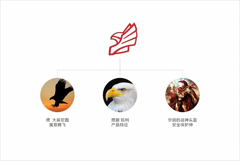 看似冰冷的工业品也应该与人类建立温暖的情感关系。创新进取、技术高超、勇敢坚韧,掌门神是守护人类安全的可靠卫士。易品牌设计小组以守护神作为原型,提取最能表达守护神形象的“战神头盔”作为品牌LOGO主体元素,融入具有宏大、腾飞寓意,且象征掌门神产品非常敏锐的“猎鹰”元素,以红色和灰色作为品牌主色调,形象威猛、硬朗中不失亲切感。以“可靠&信赖”作为超级符号的创作理念,整套视觉系统呈现高端感、品质感、国际感、可靠感